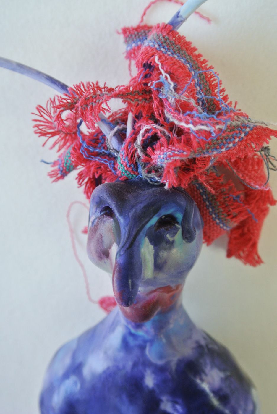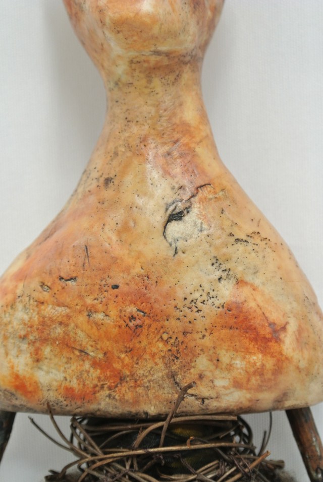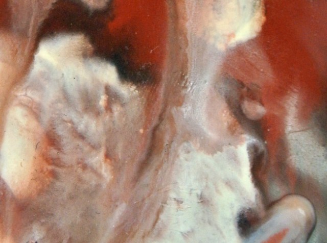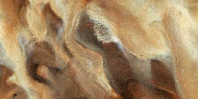 The commercial encaustic medium I use is a combination of beeswax, damar, and artist-grade pigment. In my work, I apply up to ten layers of heated wax to my paper clay substrates. I often follow the application of wax with several layers of oil pigment. Each layer is individually fused to the layer beneath it.