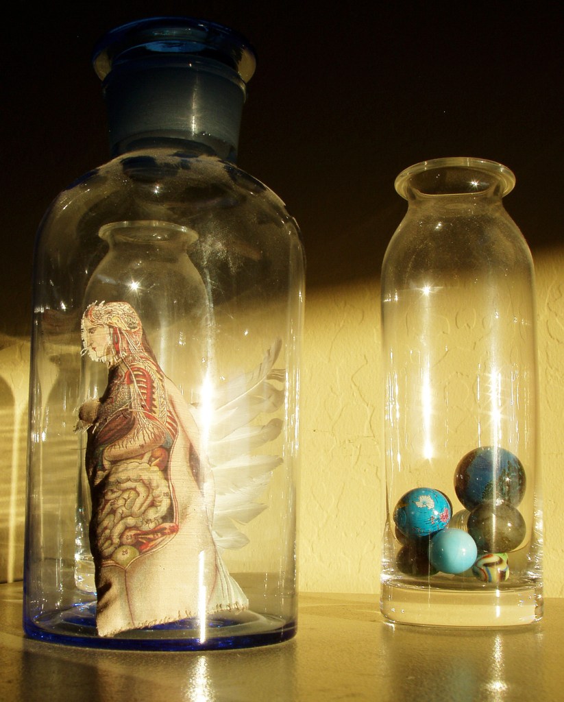 The fabric is an inkjet-printed German illustration that accompanied a 1927 book entitled The Science of Eugenics. Eugenics, the study of selective breeding for the “betterment” of the human race, formed one of the scientific bases of the Nazi’s atrocities upon humankind. I have sewn wings to this figure which obviously considers a human being as merely “meat.” The doll is encased in a sky blue bottle, trapped, as we are, between these two natures.