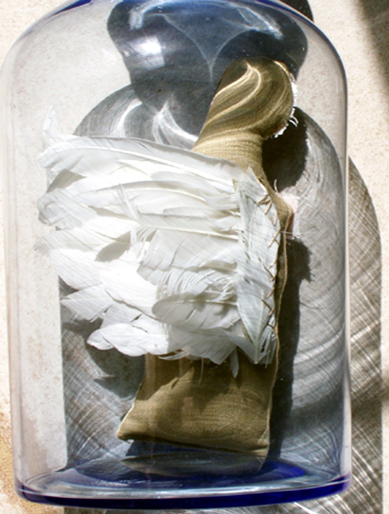 Inkjet-printed fabric paper, feathers, stuffing, glass bottle